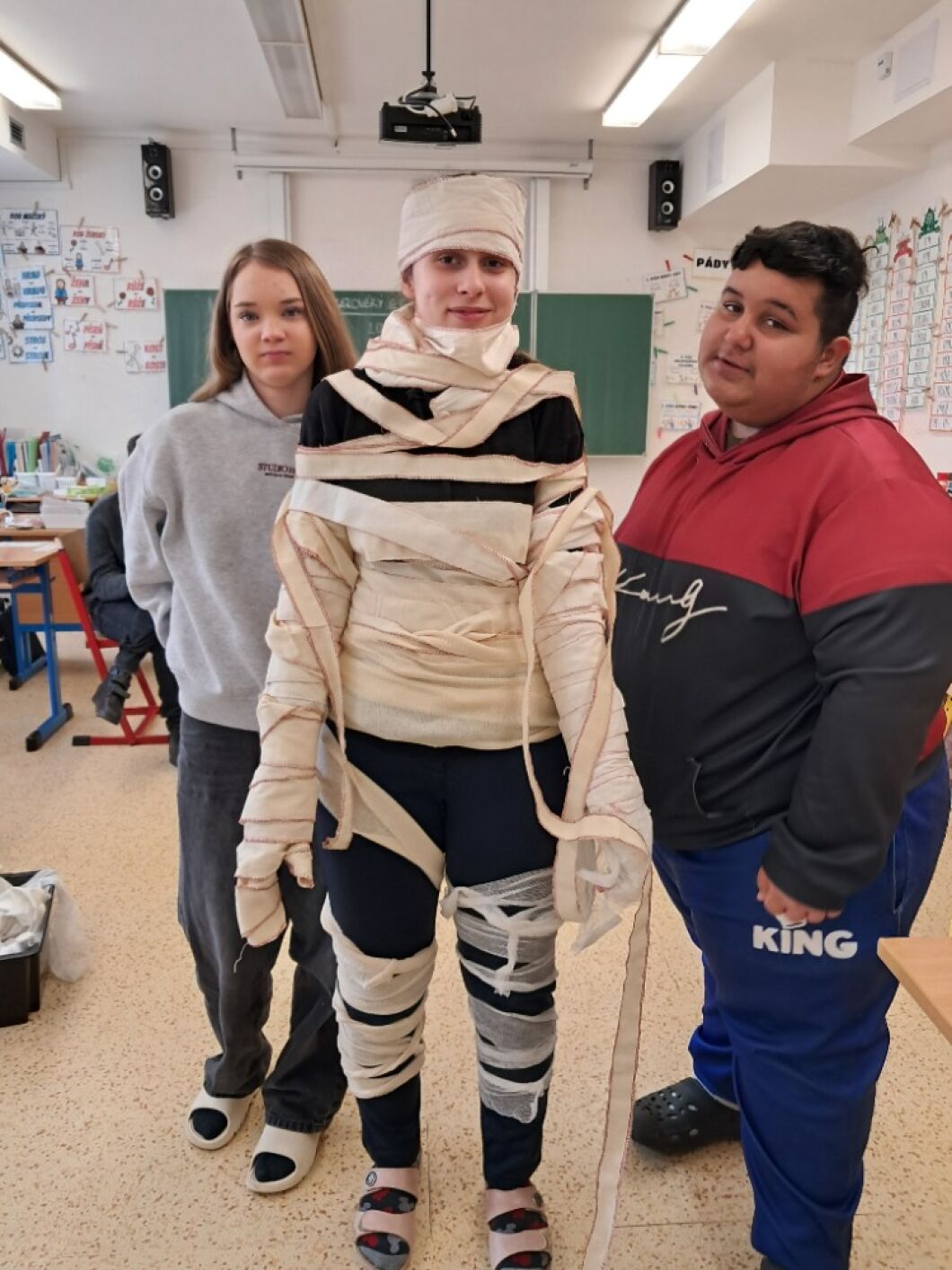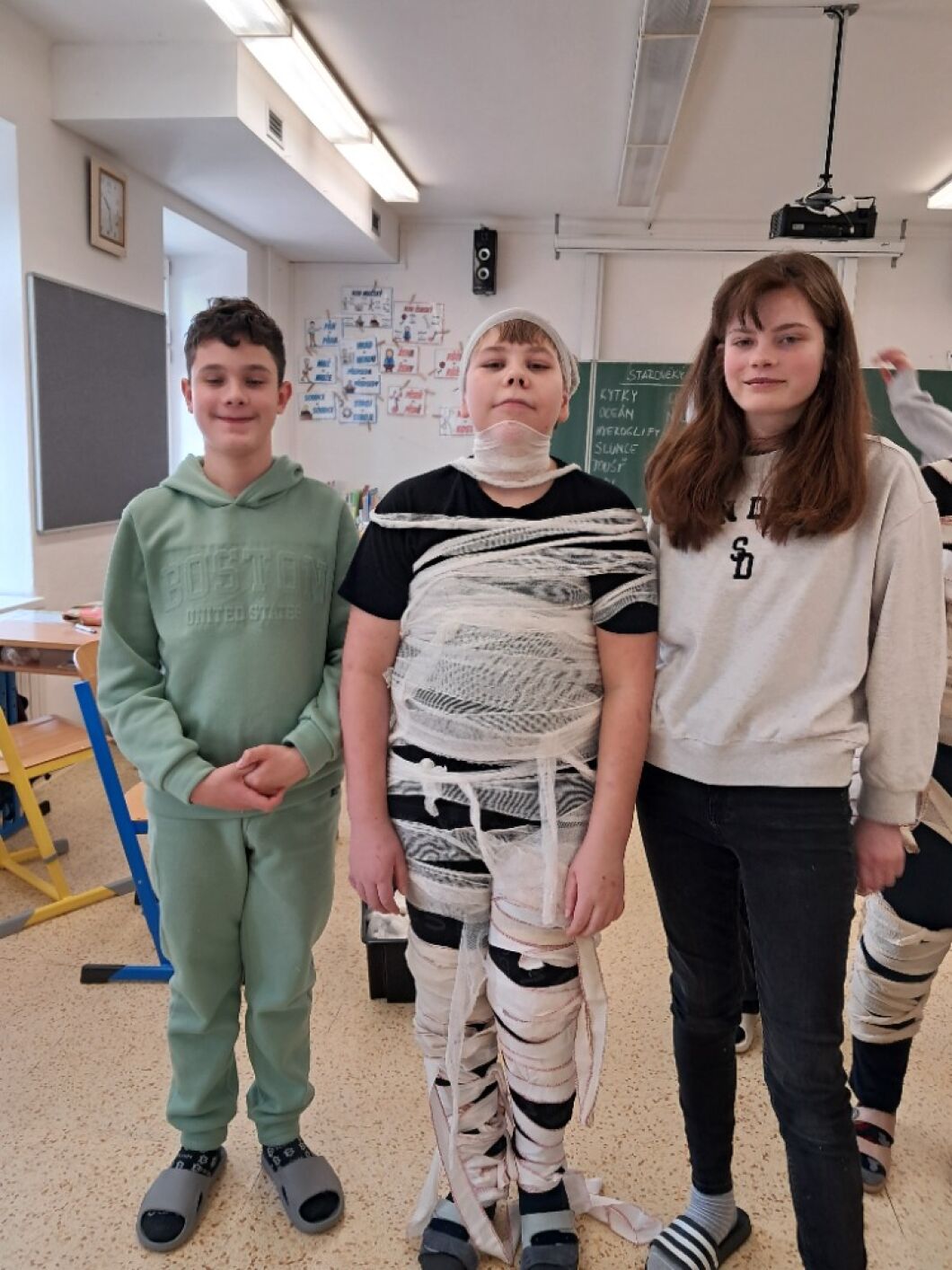 V hodinách dějepisu se žáci šestých ročníků vydali na fascinující cestu do starověku. Společně objevovali život ve starověkém Egyptě, kde si názorně vyzkoušeli, jak Egypťané nosili různé předměty na hlavě. Seznámili se také s tajemstvím stavby pyramid a své znalosti si upevnili prostřednictvím pracovních listů. Velký úspěch sklidila i tvorba „živých mumií“, při které žáci propojili získané poznatky s kreativitou a týmovou spoluprací.