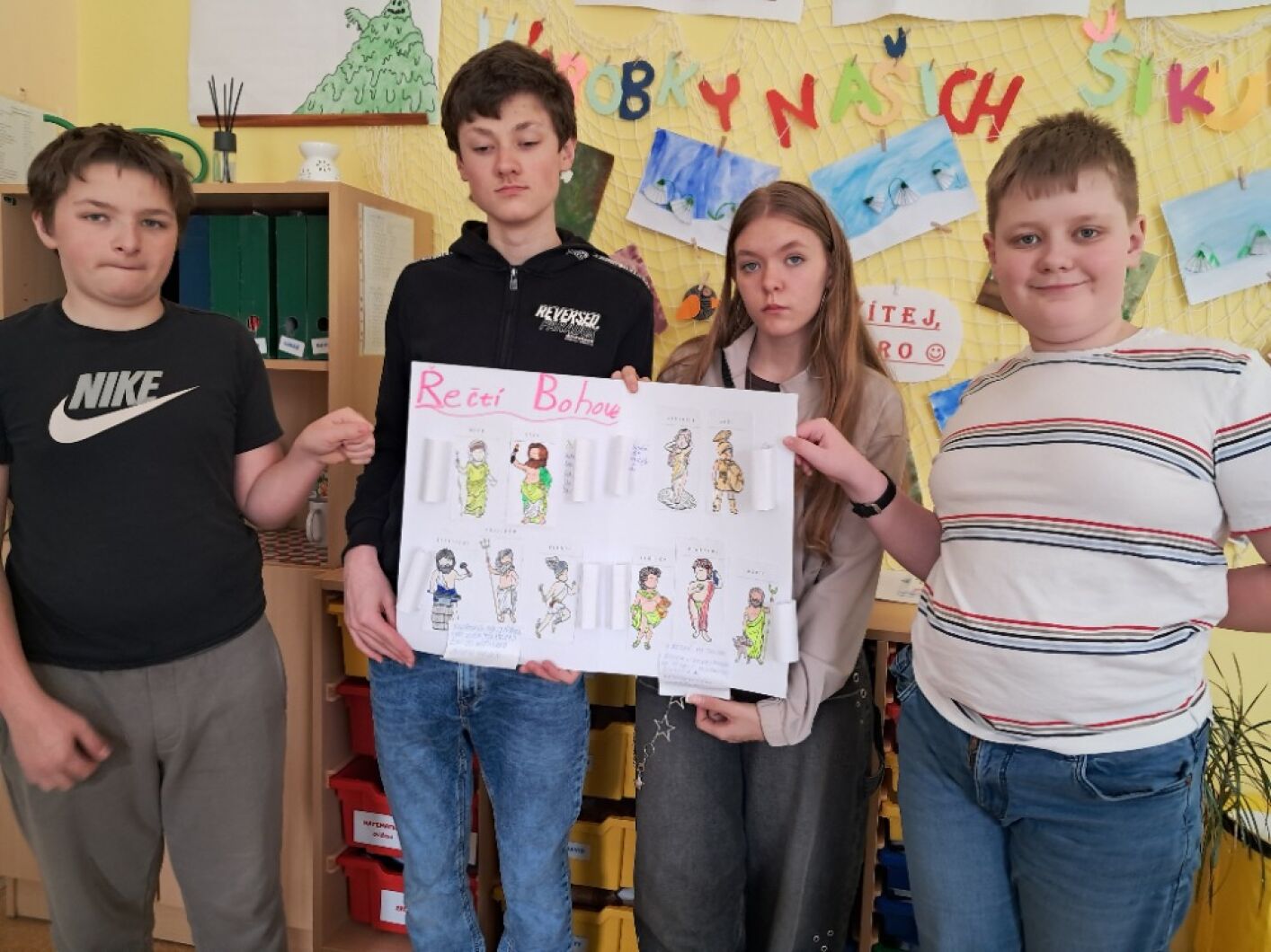 Při poznávání starověkého Řecka se výuka opírala o poutavé řecké báje a pověsti. Žáci se seznámili s jednotlivými bohy, jejich vlastnostmi i příběhy, které je provázejí. Získané informace pak společně zpracovali do přehledného plakátu, na kterém představili hlavní řecké bohy a jejich role.