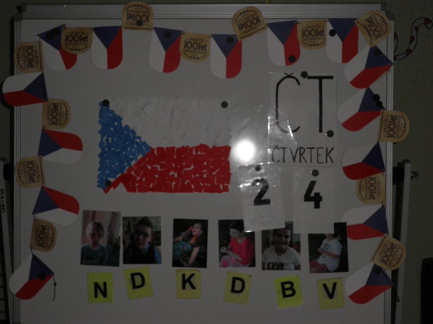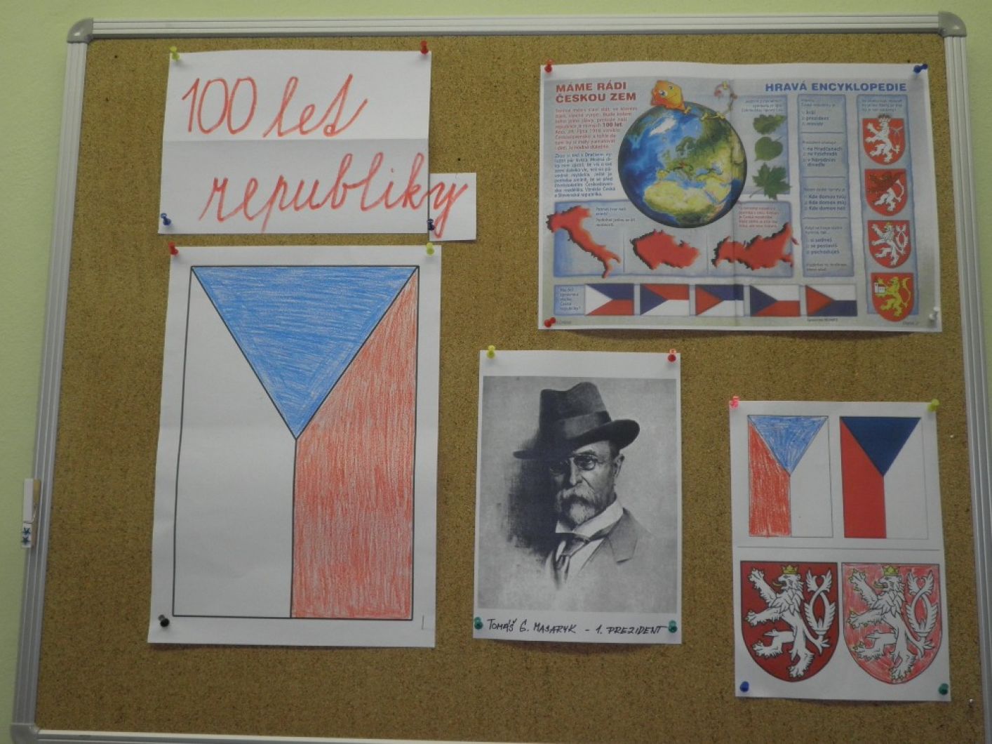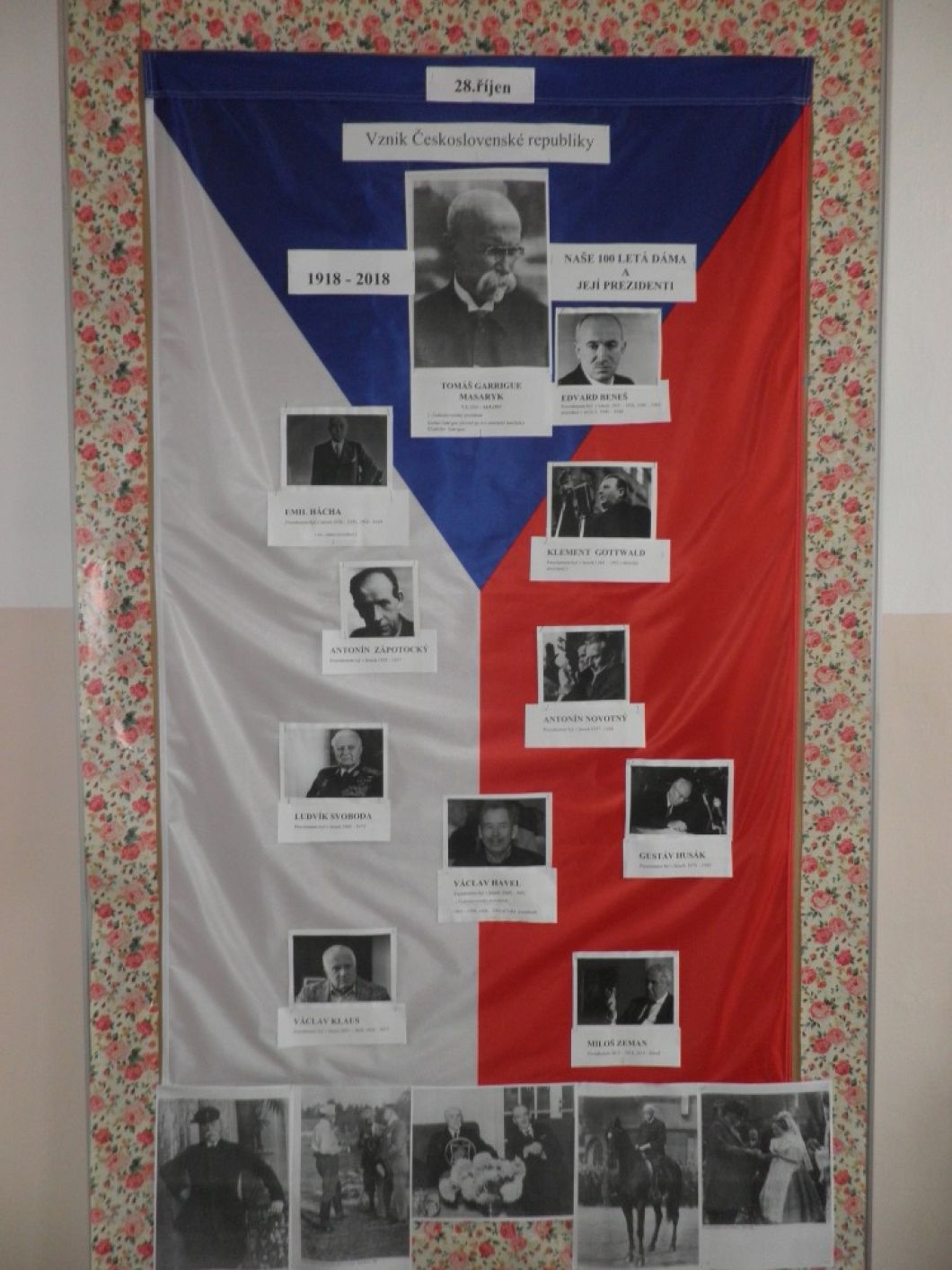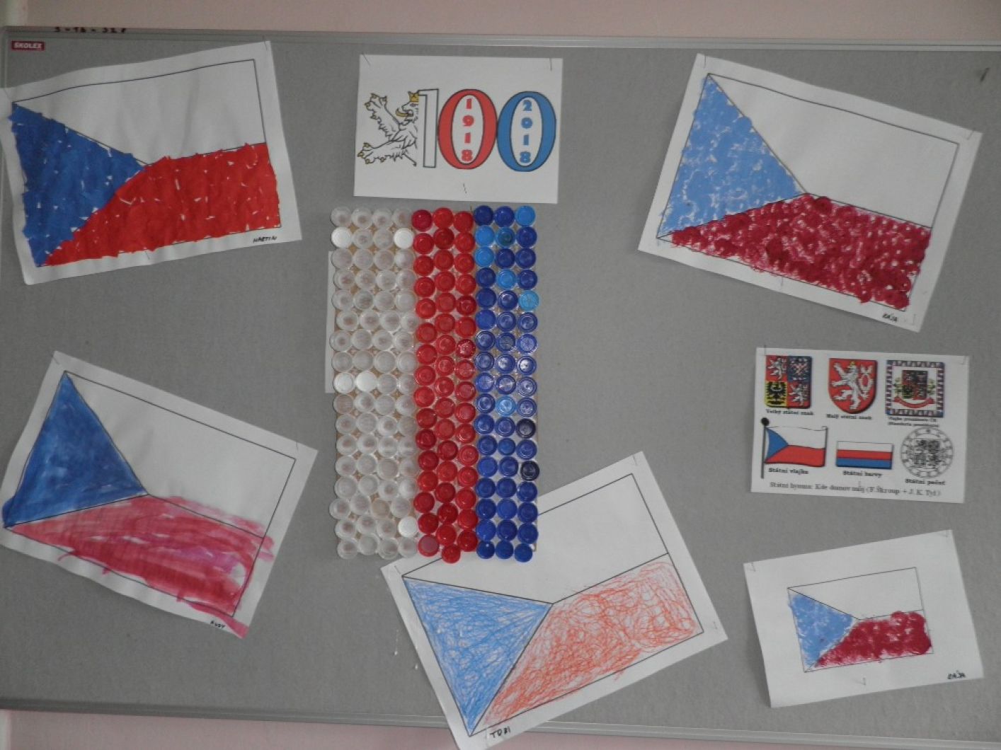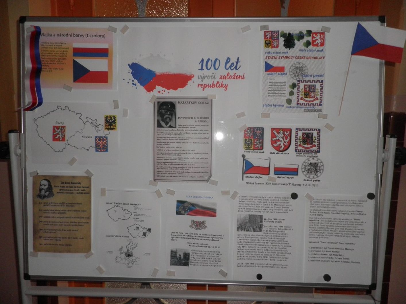 Žáci naši školy se aktivně zapojili se svými pedagogy do celoškolního projektu, pořádaného k výročí vzniku naší republiky. Žáci měli možnost plnit různé úkoly, kvízy, rébusy, dozvědět se spoustu zajímavostí a informací. Téma bylo možné propojit v různých předmětech. Žáky čekala i domácí příprava a to přinést různé množství víček od PET lahví k výrobě naší vlajky, popř. dalších symbolů ČR. V rekordním čase se nám podařilo vyrobit krásné vlajky, trikolory a ještě nám zbyl plný pytel víček, který darujeme našemu spolužákovi, který víčka s rodinou sbírá a odevzdává je. Tak si šetří korunku ke korunce na speciální rehabilitační pobyt v zahraničí. Děkujeme rodinám žáků za vzornou spolupráci se školou. Krásné výrobky zdobí vchod do školy. Celoškolní projekt dnes vrcholil akcí na školní zahradě, kde nechyběly krojované paní učitelky, sázení lípy, aj. Fotografie nejen z projektu, můžete vidět v přízemí školy v naší televizi.