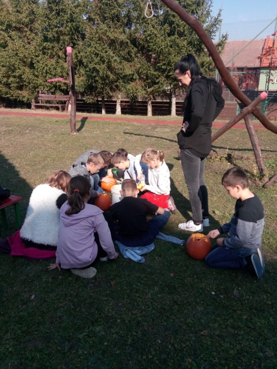 Ve dnech od 15. 10. do 18. 10. 2018 probíhal sběr přírodnin (listy, větve, traviny), kterými žáci následně přizdobili vydlabané dýně. Jelikož nám přálo počasí, dlabání dýní se mohlo konat na školní zahradě. Akce se zúčastnilo celkem 13 žáků z různých tříd naší školy a všichni si to moc užili. Dýně nám teď zdobí vestibul školy.
