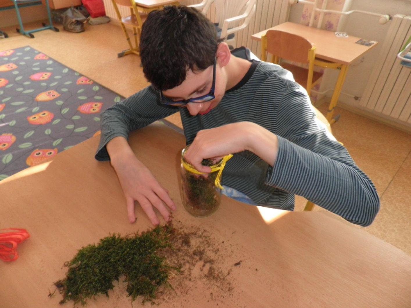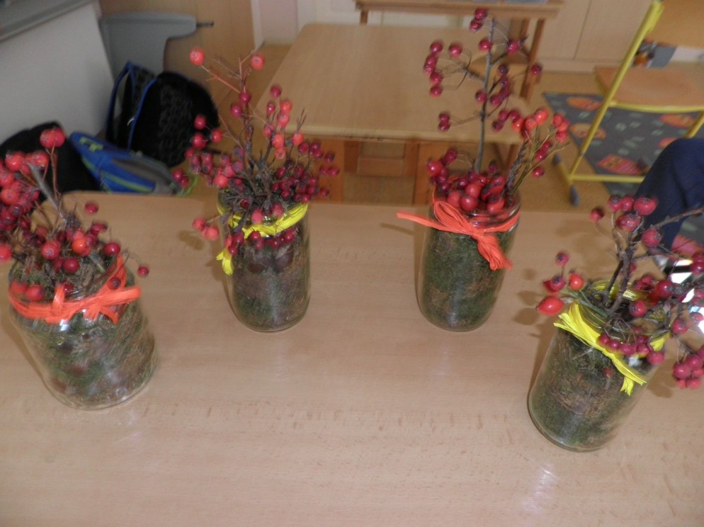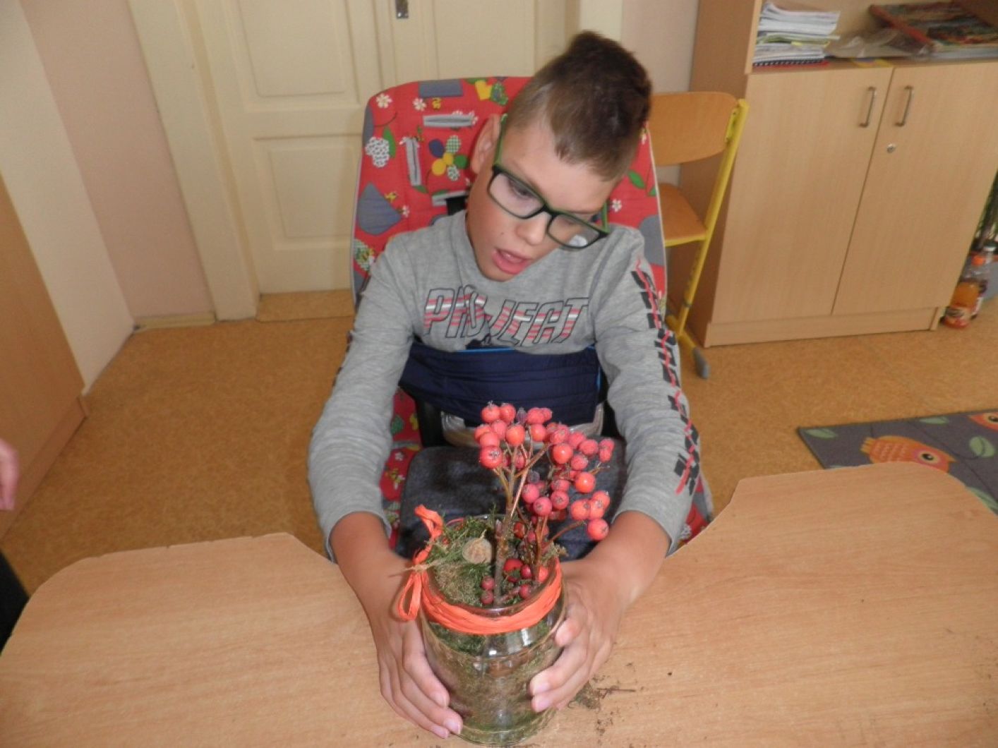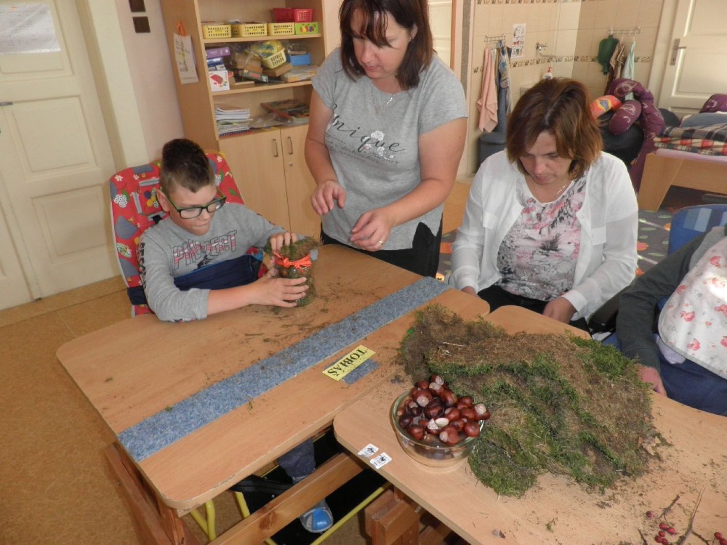 Ve středu a ve čtvrtek probíhala v naší třídě tzv. zážitková výuka. Žáci seznamovali se znaky podzimu, zejména s plody a přírodninami - mech, šípky, kaštany, jeřabiny, aj. V přírodě je poté hledali a sbírali. Viděli, kde rostou, v jakých podmínkách. Ve třídě si o nich povídali, osahali je a závěrem aranžovali za pomoci pedagogů. Výsledkem byly krásné skleničky, které si žáci odnesli domů