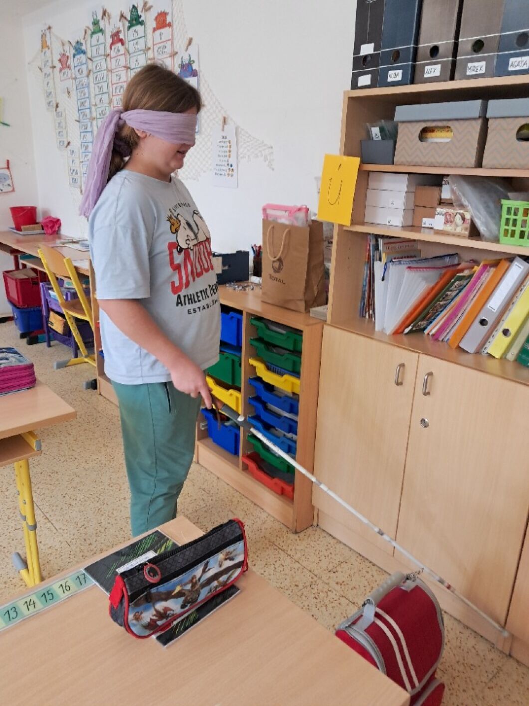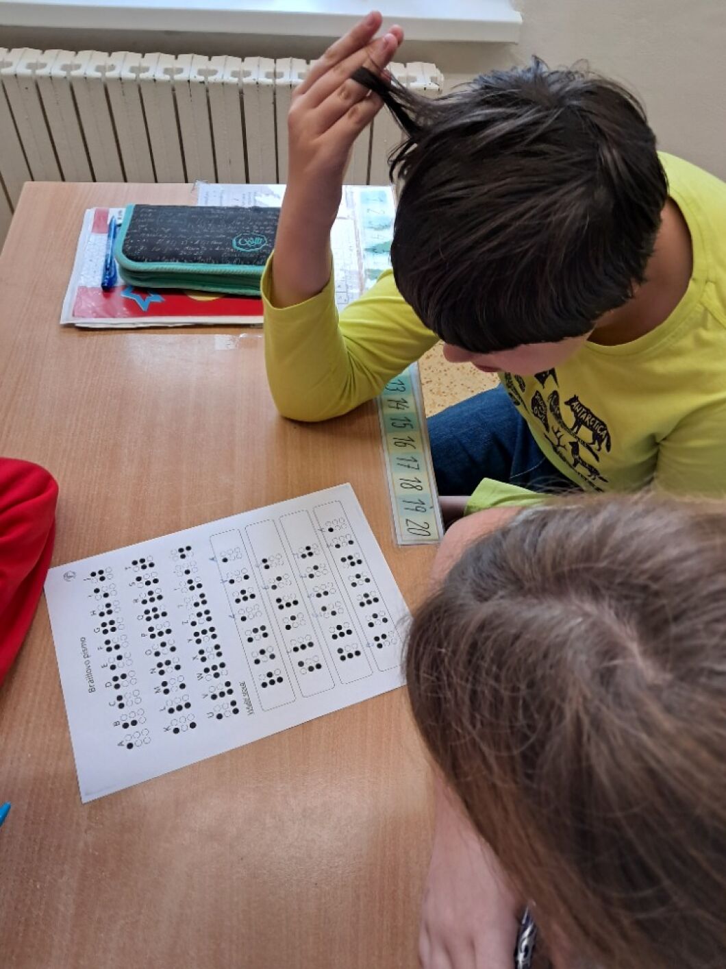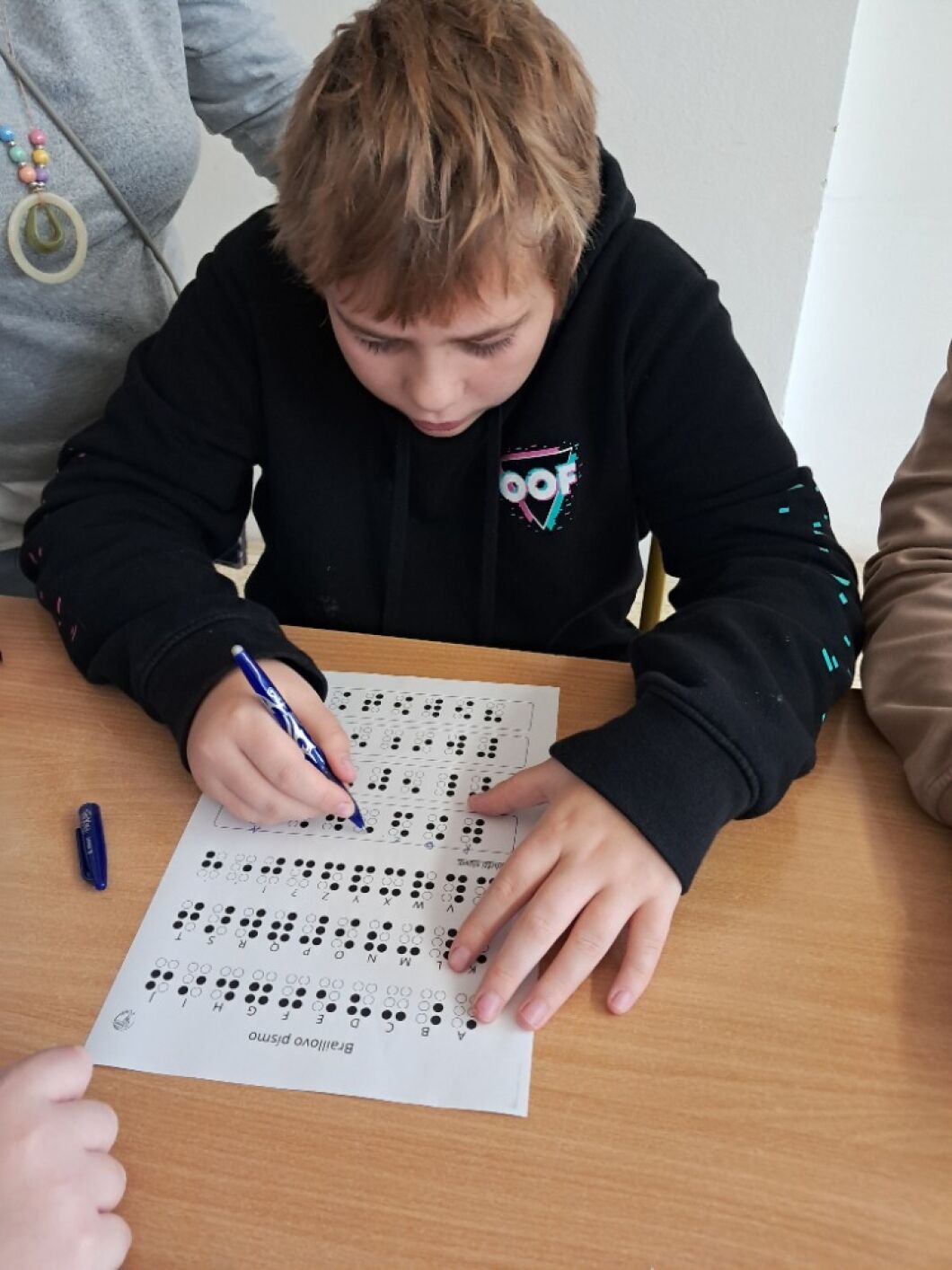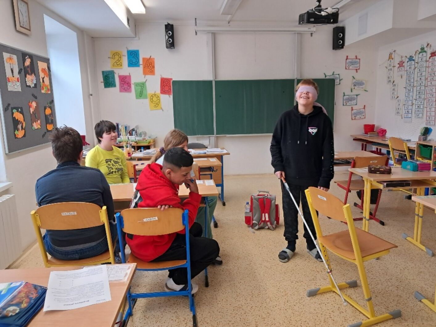 13. listopadu si připomínáme, že můžeme svět vnímat různými způsoby. Žáci VIII. a VII. třídy si v hodině občanské výchovy vyzkoušeli, jak obtížné je se pohybovat ve známém prostředí, když najednou okolní svět nevidíme. Na příběhu kamarádů ze školy Rozárky, Dorotky a nevidomého Matěje si přiblížili život nevidomých. Seznámili se s Braillovým písmem – jedinečným vynálezem pro čtení. Sami pomocí soustavy šesti teček luštili slova a věty. Prohlédli si i jiné pomůcky, které usnadňují život nevidomým. Za ně děkujeme panu asistentovi Kubovi. Ve společné hodině se žáci naučili, že přátelství nezná žádné překážky.